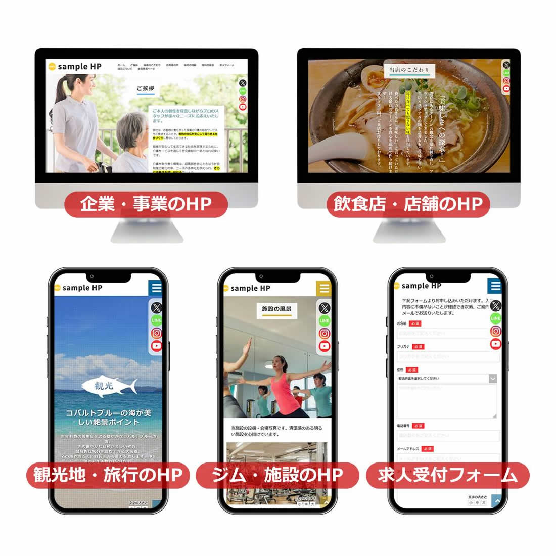 画面サイズに併せてホームページが最適表示されますので、パソコン、スマートフォン、タブレット、どれでも問題なく表示されます。